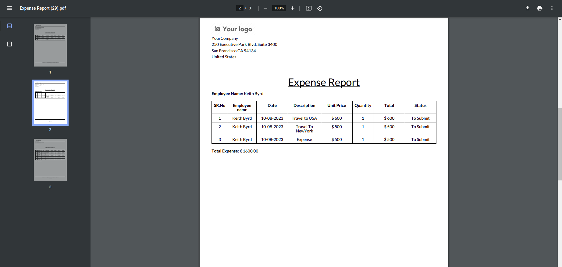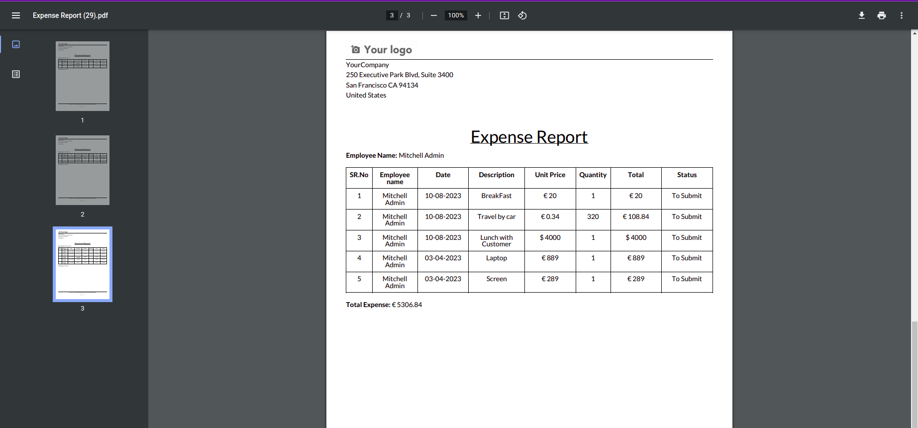 This application facilitates the printing of employee reports, offering the admin the flexibility to generate multiple expense reports using custom dates. Additionally, the admin can print reports based on various status categories, such as to submit, submitted, approved, paid, refused, or view all reports.