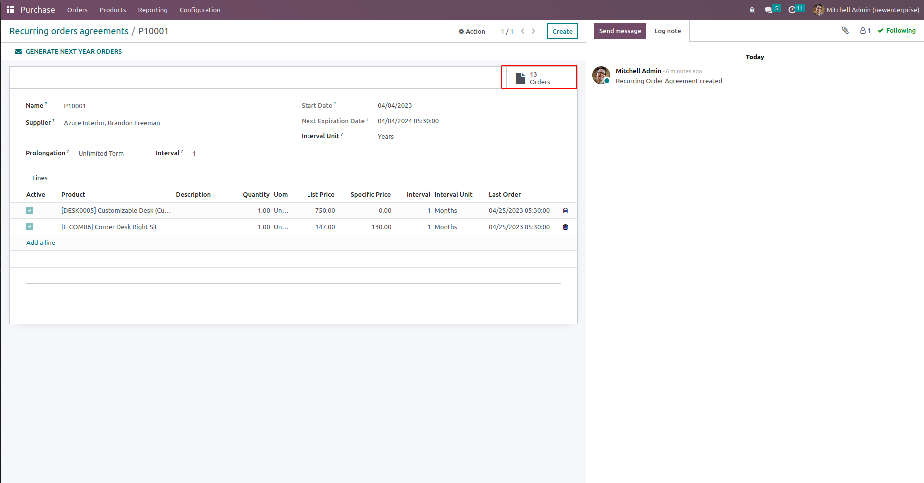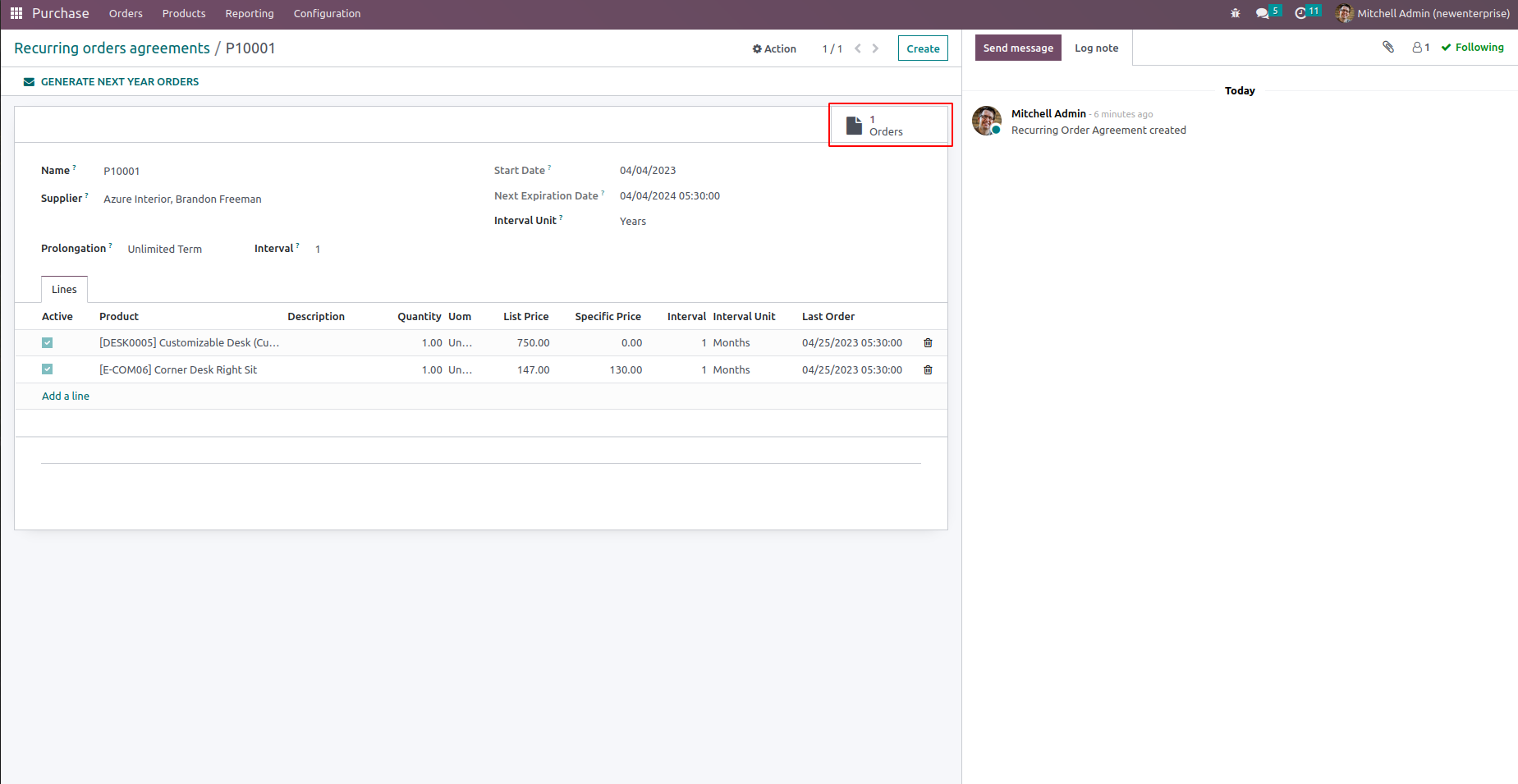 We can see all orders created from the recurring purchase agreement from the smart button which shows the number of orders.