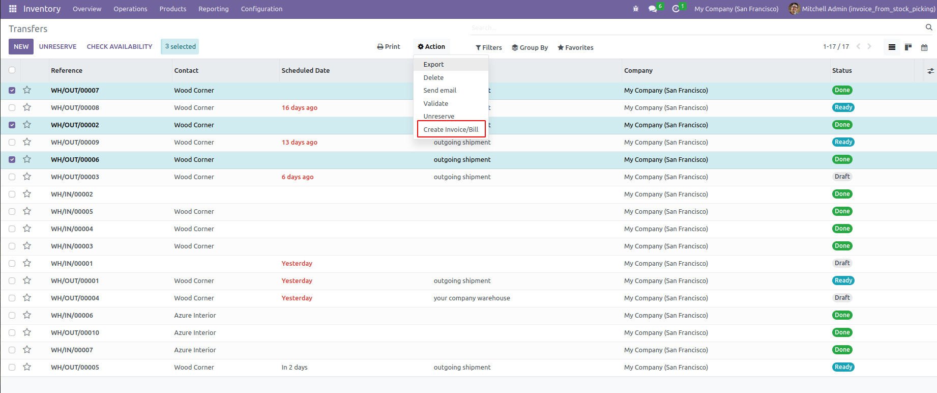 select multiple transfer with same transfer type and with different partner from the tree view. It will create a single invoice/bill for each transfer.