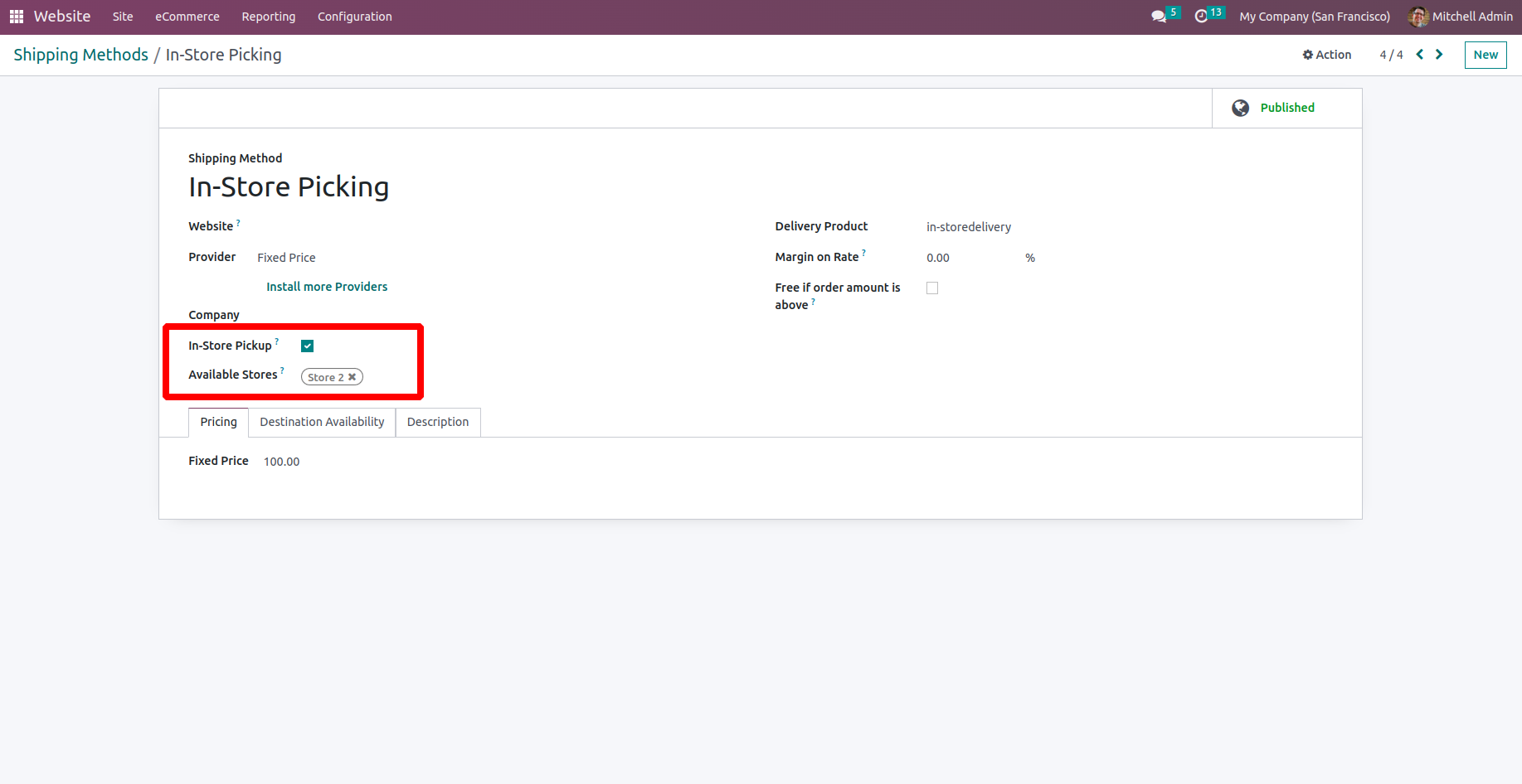Create and Publish the Delivery Method for In-Store Pickup by Enabling the Store Pickup Option.In the Available Stores field, Leave Empty to Display all Stores in the Website Sale and Choose the Desired Stores to Restrict other Stores from Display in Website.
