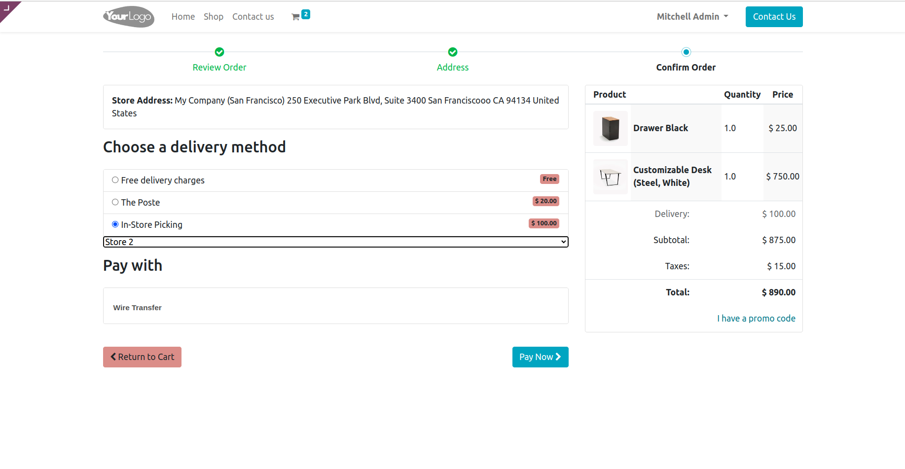 Choose the In-Store Delivery Method and Select the Store for Pickup.The Corresponding Store Address will be Updated in the Shipping Address Section.
