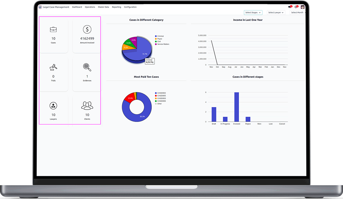 Shows most paid 10 cases, cases in different stages, last one year revenue and case in different category.