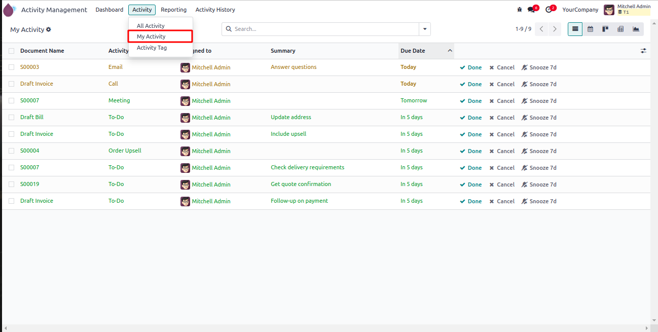 On clicking the button "Activities", a popup appears where we can create and schedule activities.