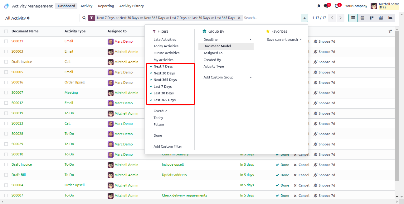 Filter for next 7 days, next 30 days, next 365 days, last 7 days, last 30 days and last 365 days.