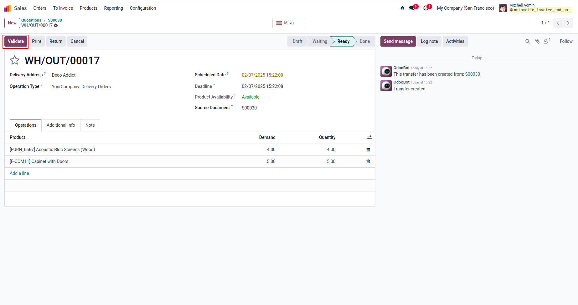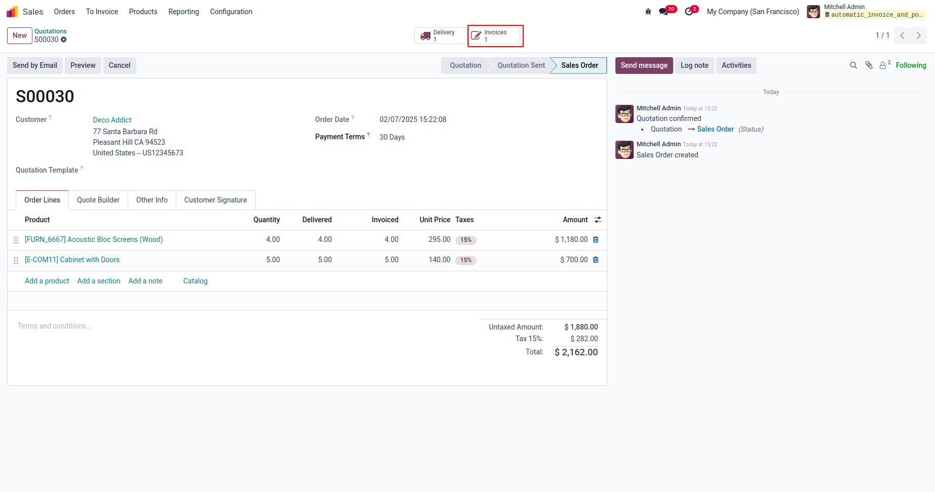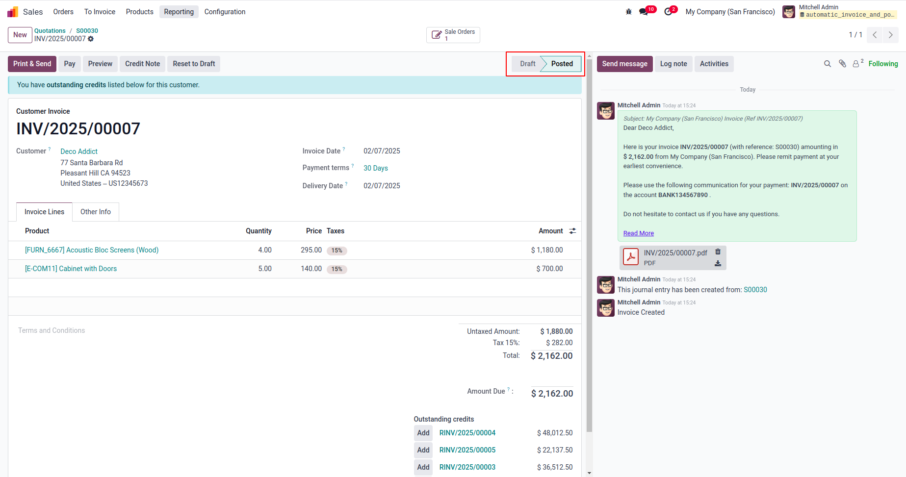 User can see invoice is validated automatically and sent message is linked with chatter which is sent to customer.