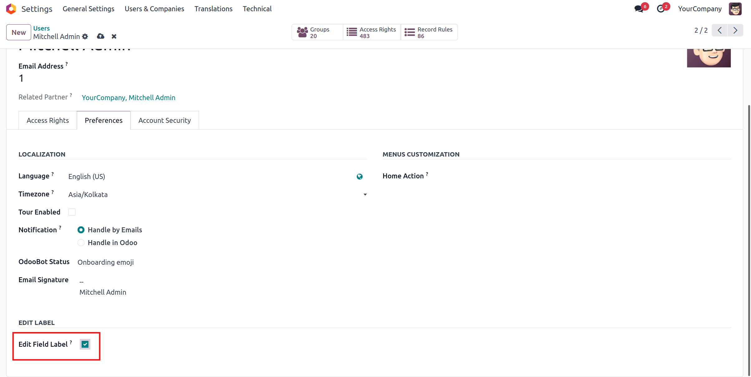 Go to Settings --> Users & Companies --> Users and enable Edit Field Label