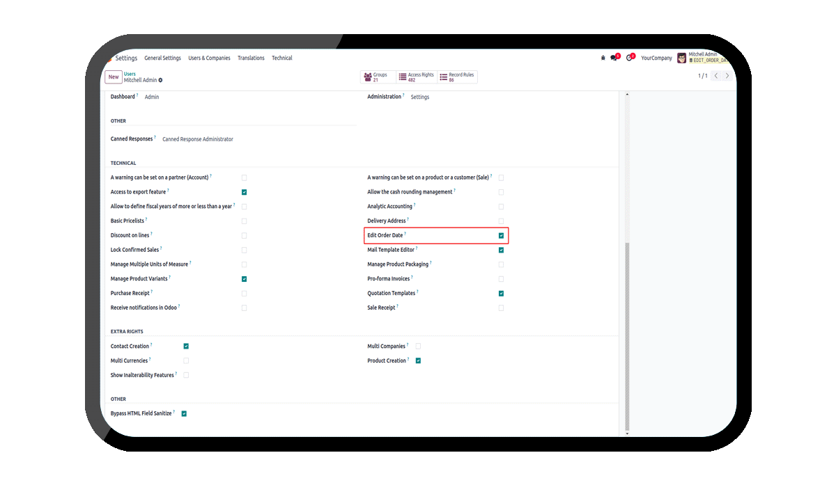 Access to edit the order date can be granted by enabling the 'Edit Order Date' field in the user's access rights.