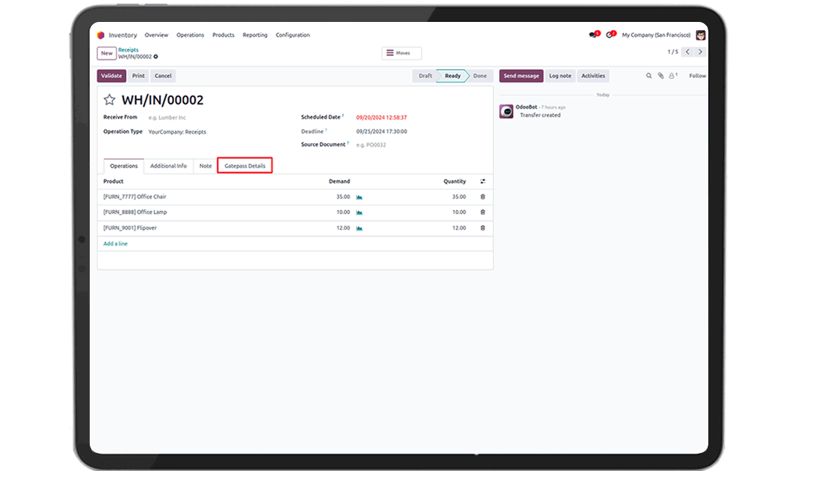 Gate pass modules make it possible to create gate pass tickets that include information on the driver, the firm to which the vehicle belongs, as well as the entry date and time,and the vehicle's details, additionally, as the product details listed in the delivery order.