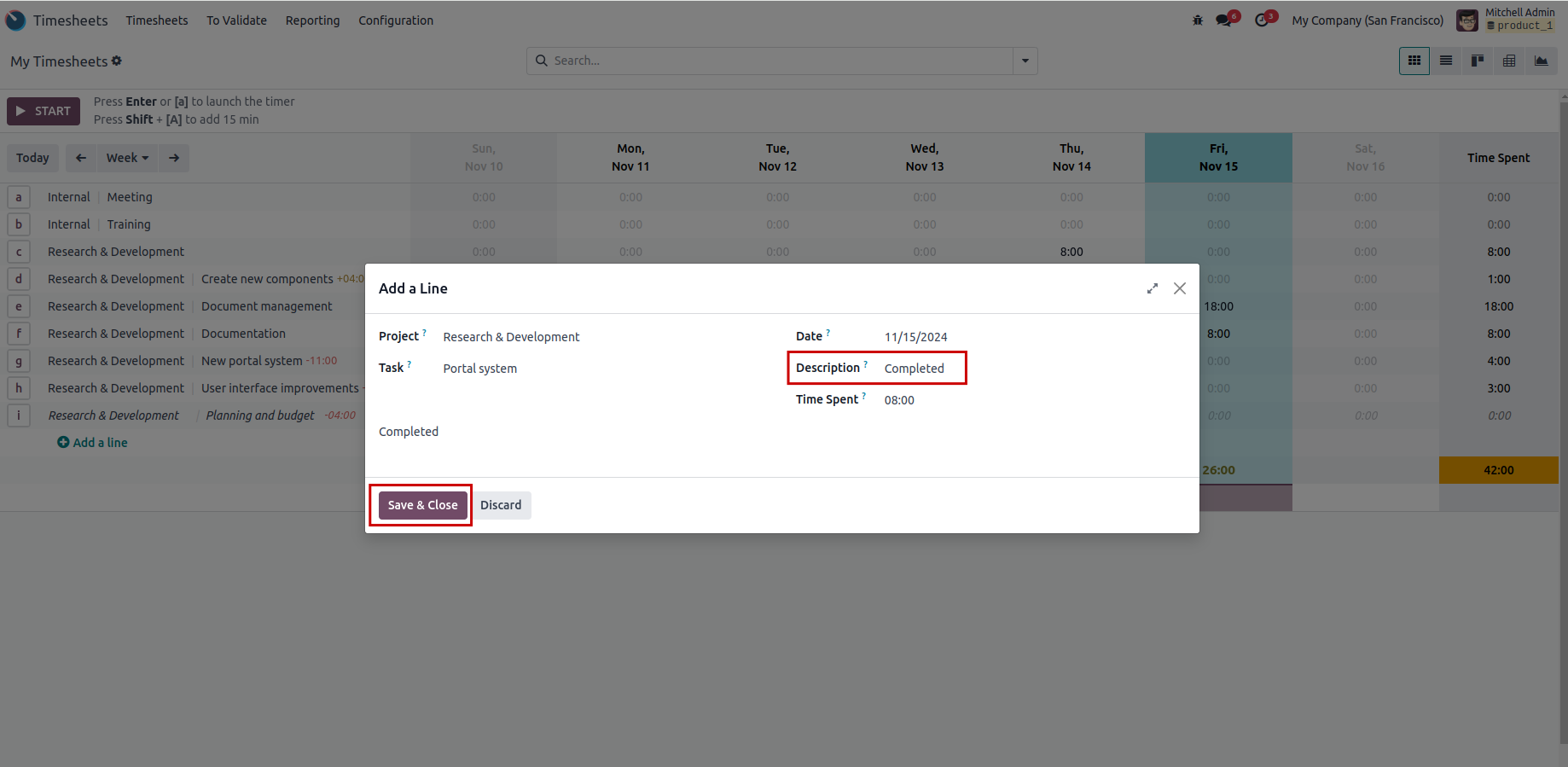 In Timesheet module we can add timesheet for the tasks like below. In here we can see a new field for adding description of the current task.
