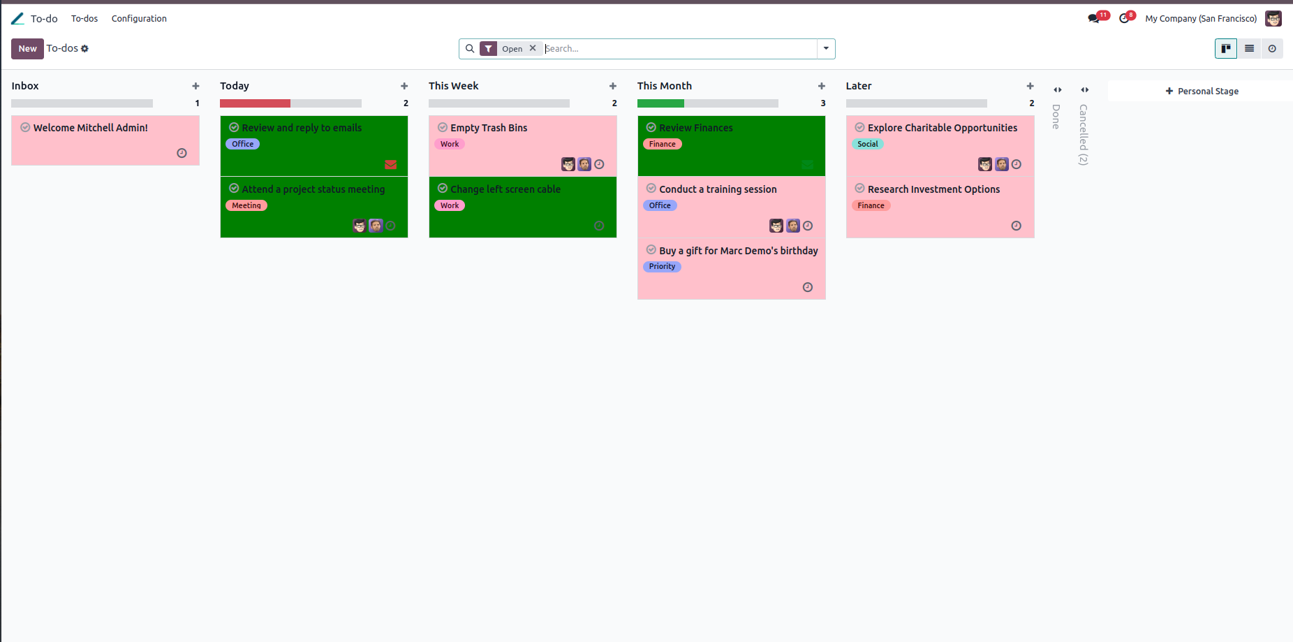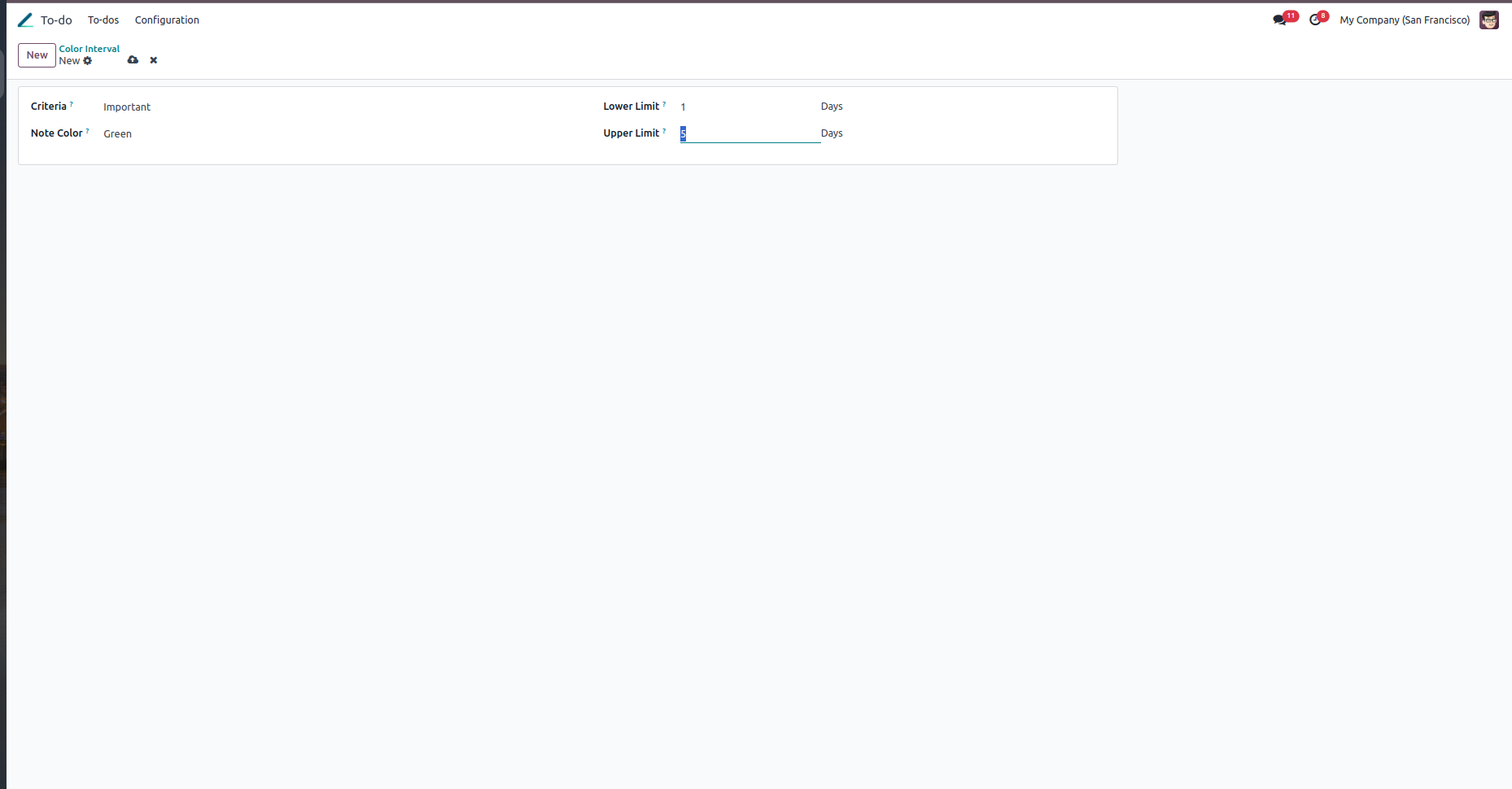 Under Color interval, create an interval of days: days from the current date to the deadline date. Lower limit and upper limit are used to create the interval.