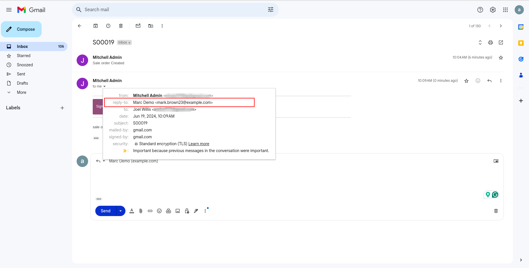 Go to Settings -> Technical -> Messages. Here, you can view the messages you have sent. In the reply-to options, you will see the user we specified.