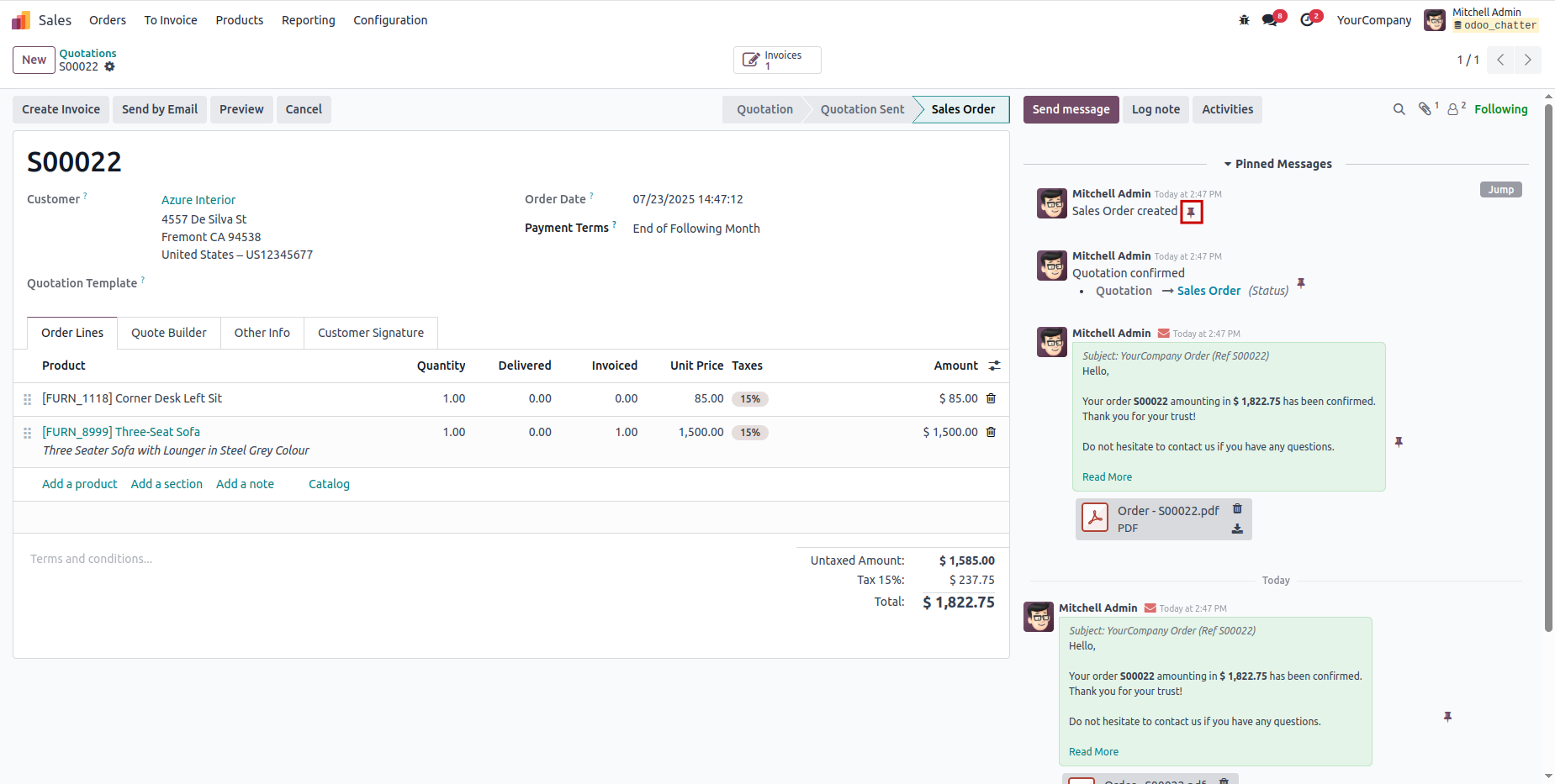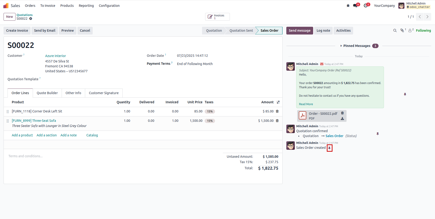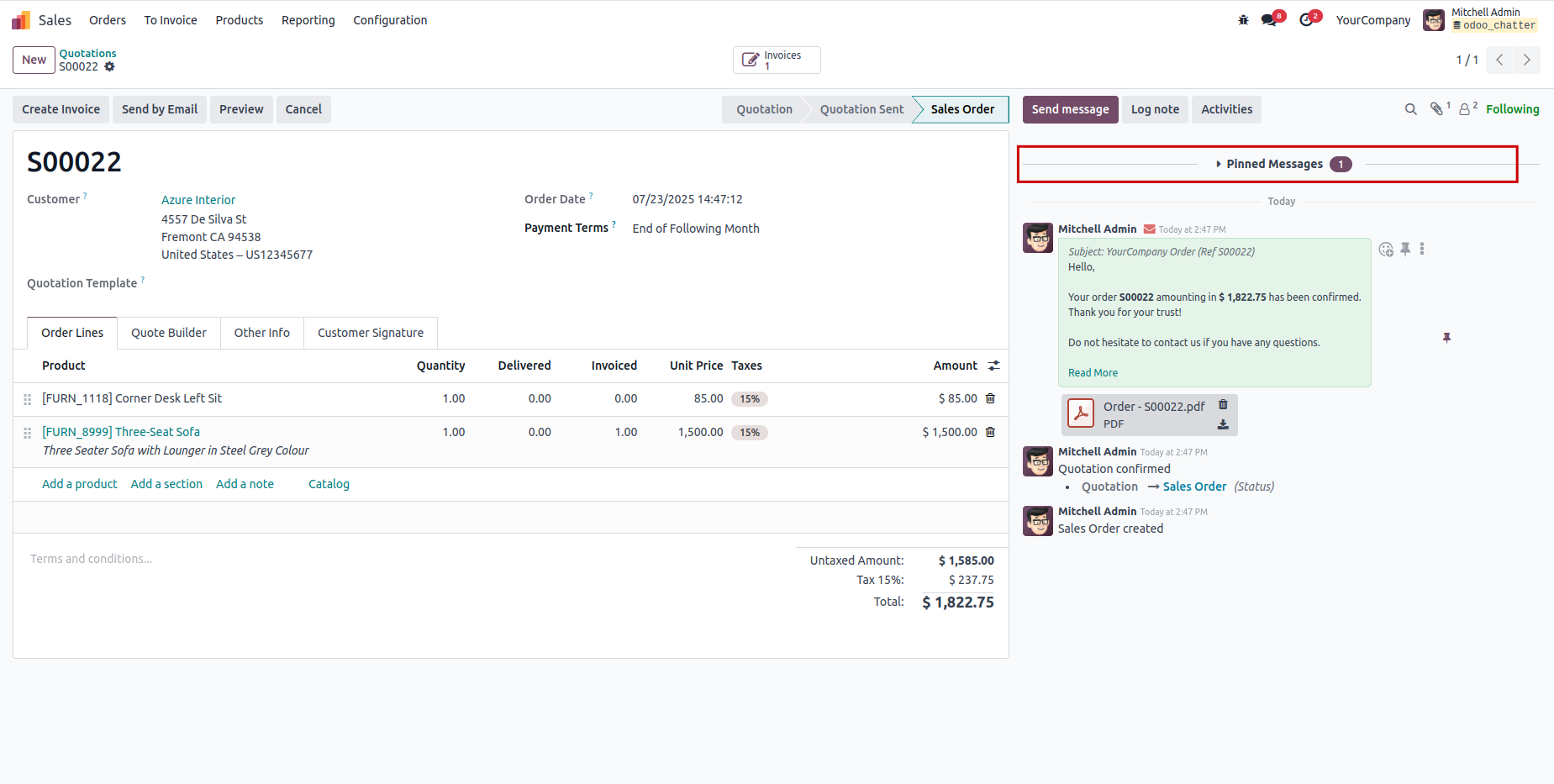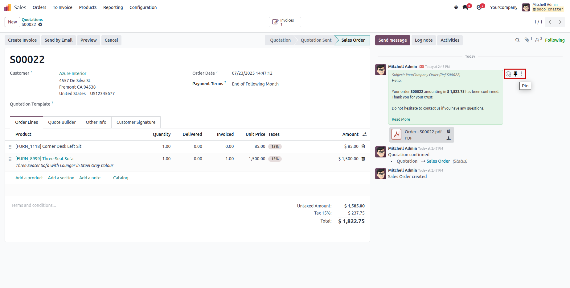 Click the pin icon next to a message or log note in the chatter. The message will be marked as pinned and stay easily accessible.