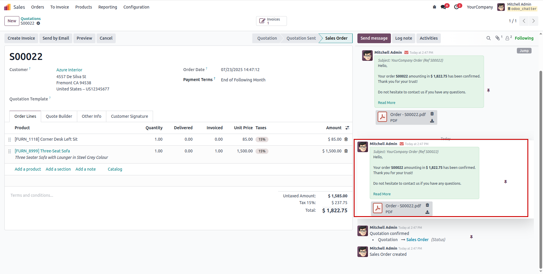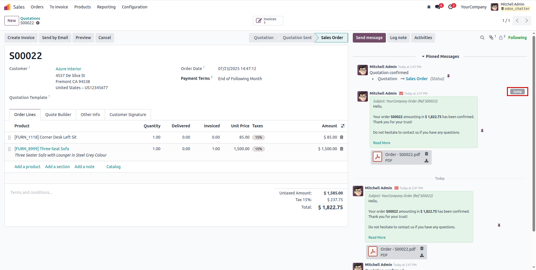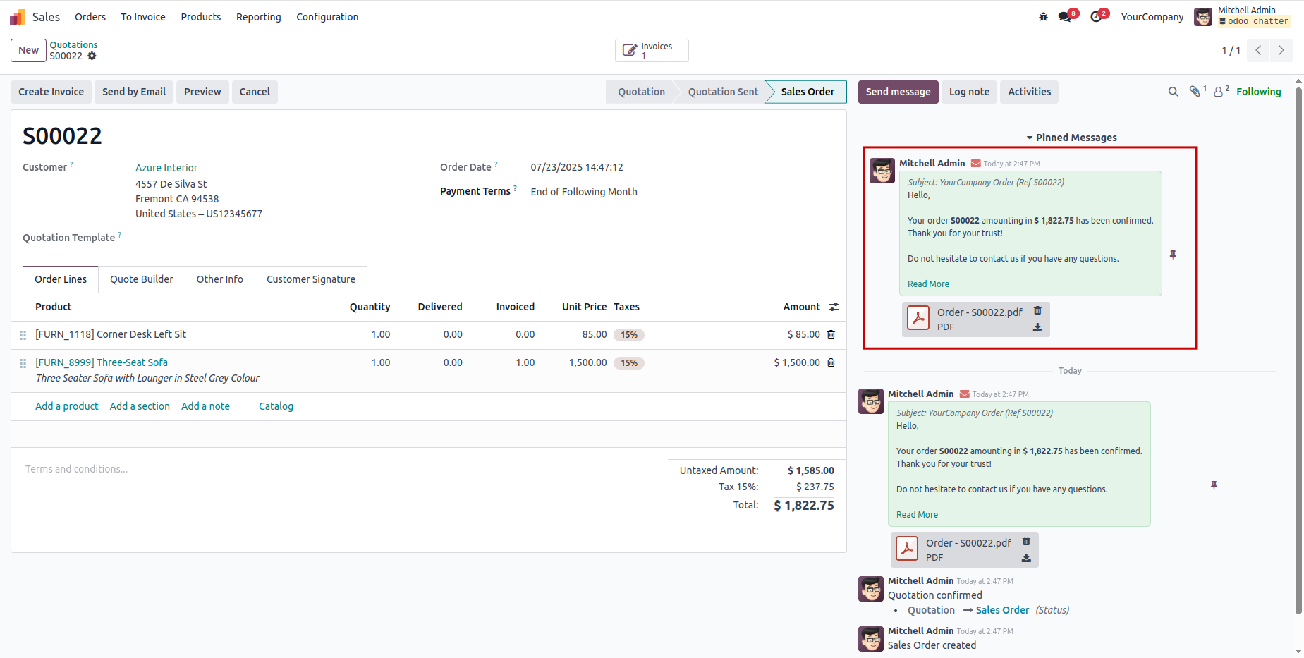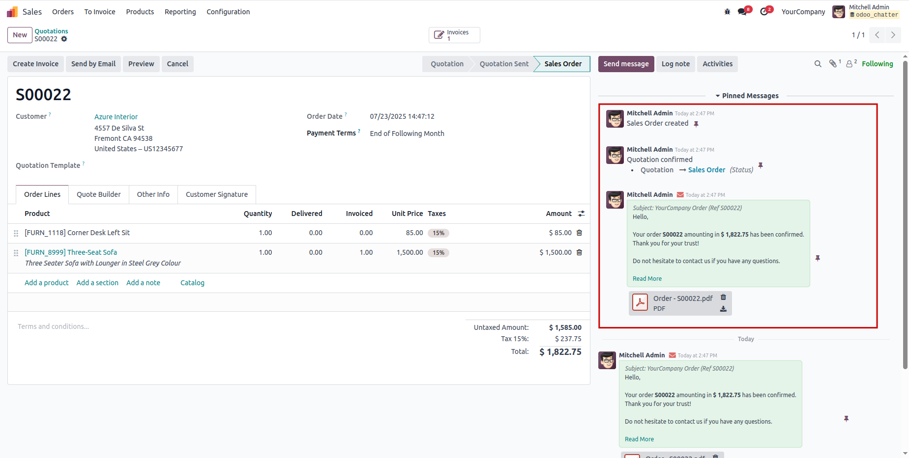 Click the pin icon next to a message or log note in the chatter. The message will be marked as pinned and stay easily accessible.