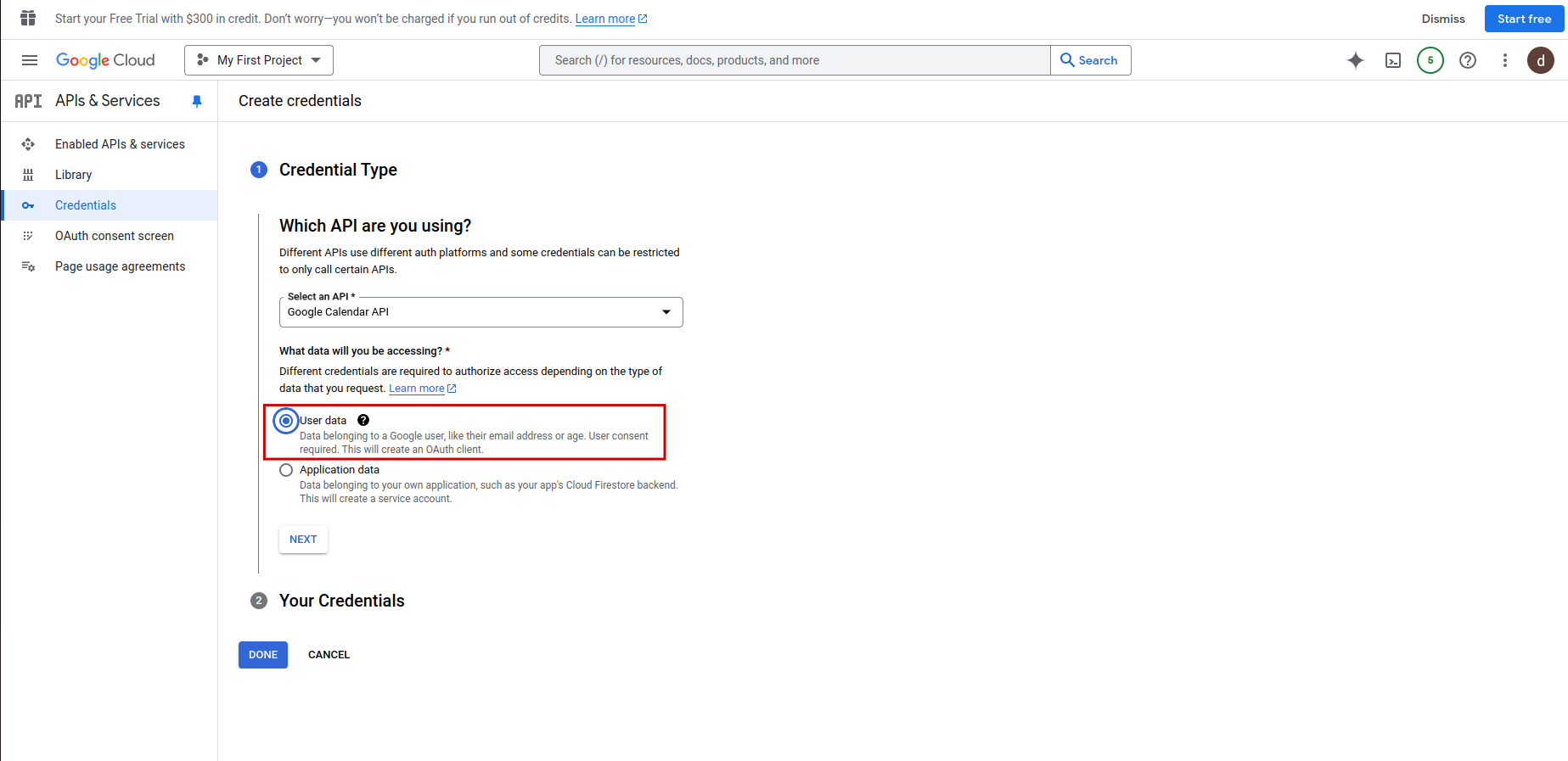 5. Choose Google Calendar API and the User Data . Then, click Next.