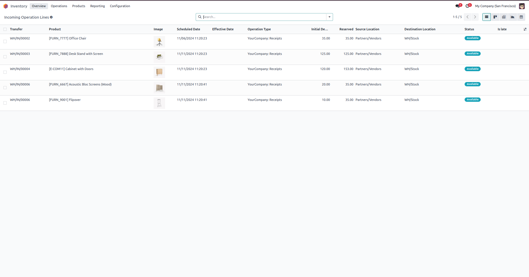 Incoming Picking Operations Views with images of their related products Record