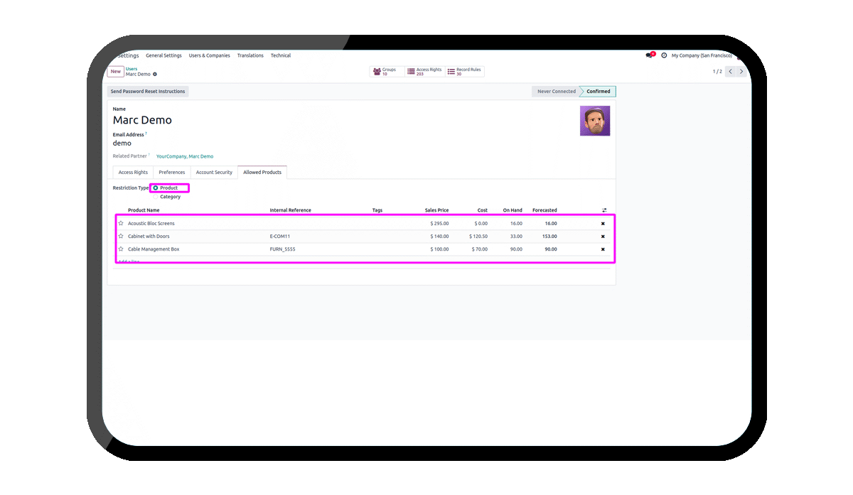 Showing the allowed products based on chosen product category for the user Marc Demo.
