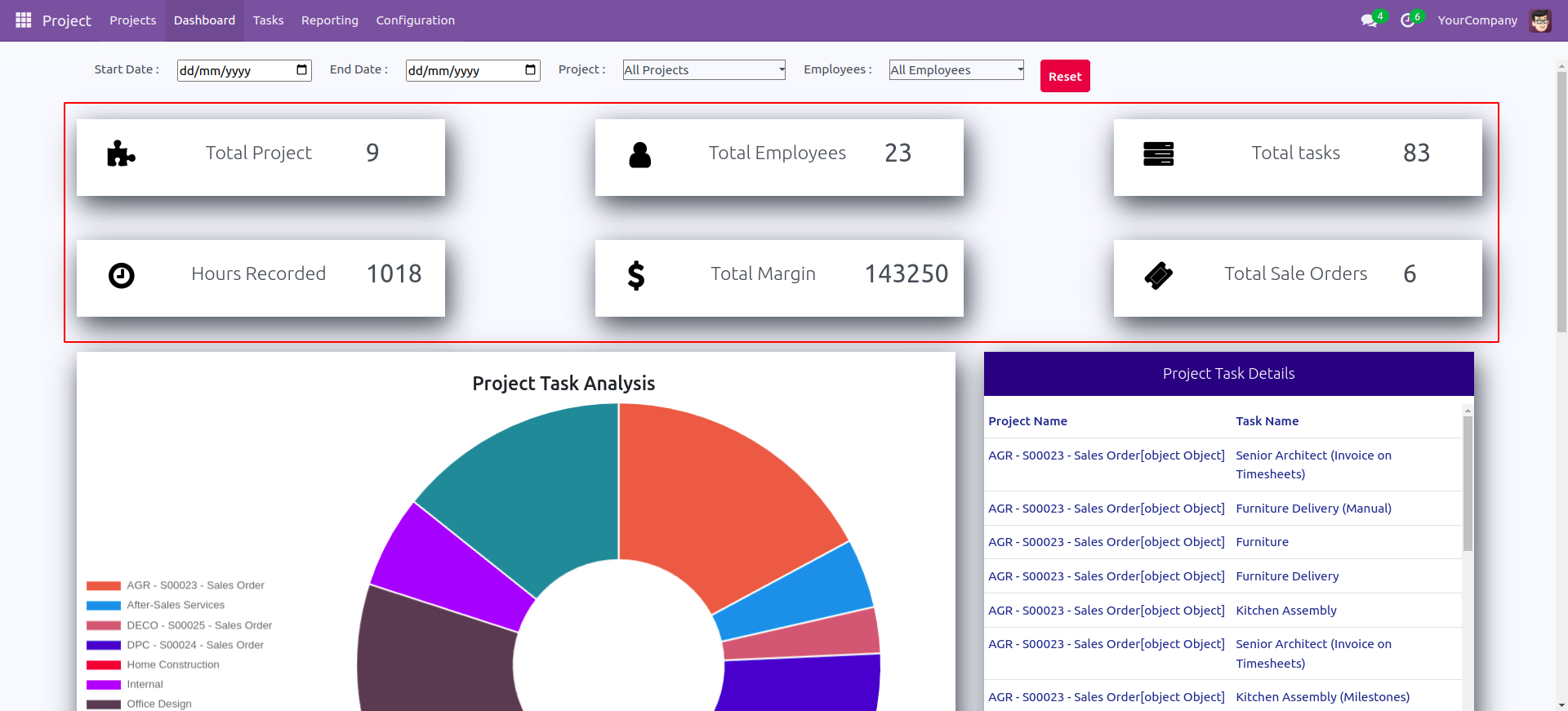 Project Dashboard has different types of Graphs that will give you a complete analyzing of the Project module.