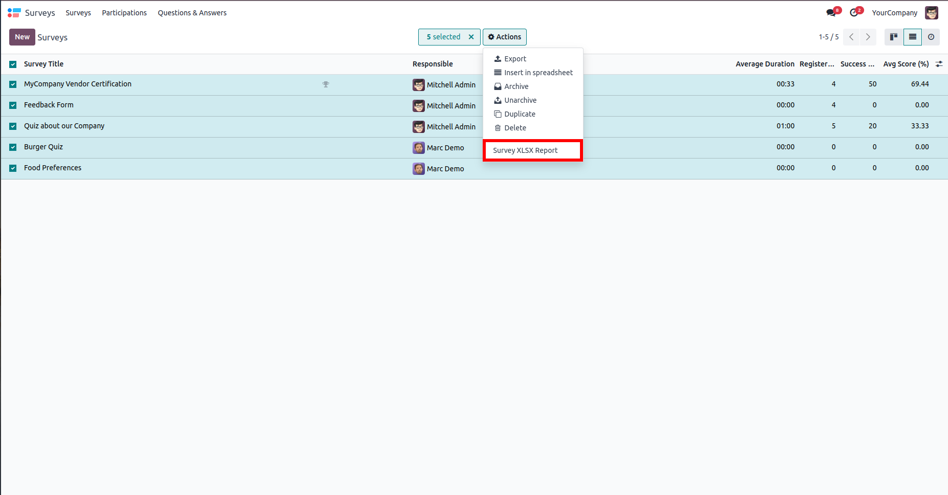 This Module helps to Export Survey Answers in XLSX Format. You can easily get the Questions and Answers of the Corresponding User.