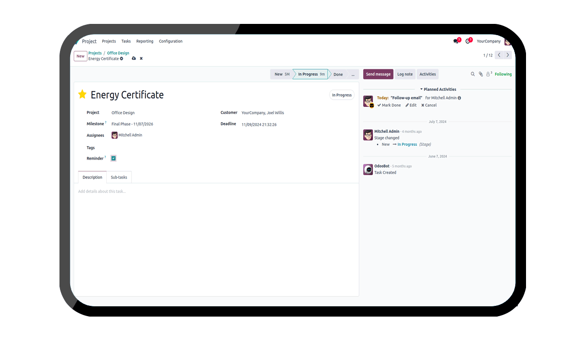The Task Deadline Reminder module is an Odoo app that sends automatic reminder emails to users responsible for tasks on their due date. It helps users stay organized and avoid missing critical deadlines by notifying them through scheduled reminders.