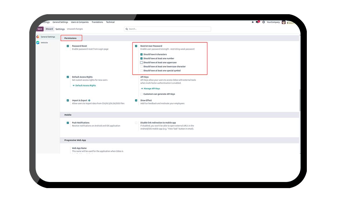 A simple user interface to configure password rules in the Settings. No need to modify the user form manually, as it integrates seamlessly into the Odoo backend.
