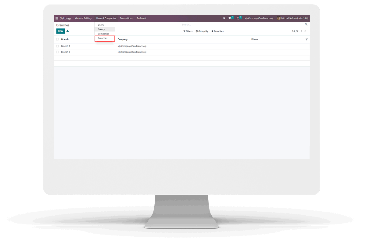 Administrator can create Branches for the company from Settings -> Users & Companies -> Branches -> Create