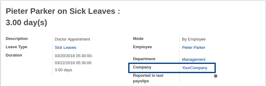 This module enables hr multi company, hence hr manager can easily handle multi company process separately. We can activate multi company feature in general settings as usual. This will automatically add company field in every hr related records.