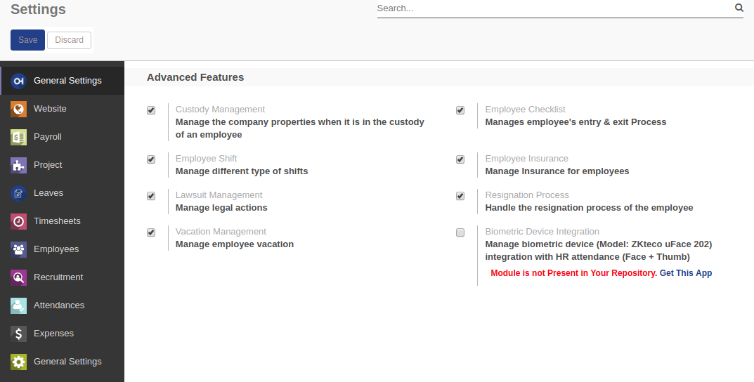 Open HRMS is keeping selective approach. You can install its other features as plugins from settings menu.