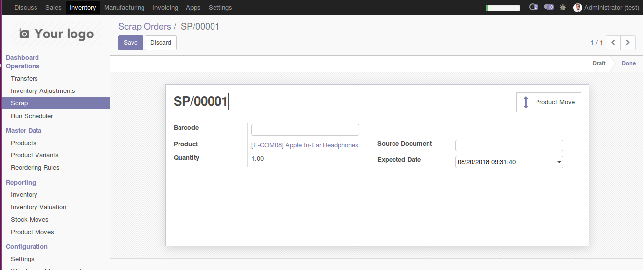 With this module you can avoid manual entry of product in scrapping. Presently you have to select the product from the list and enter the quantity.