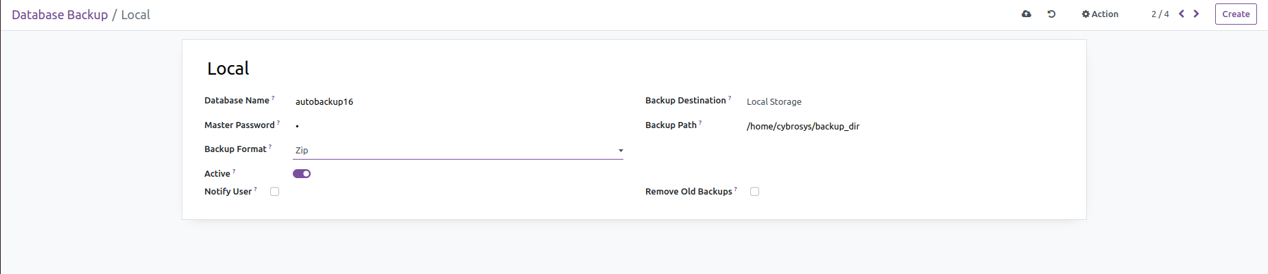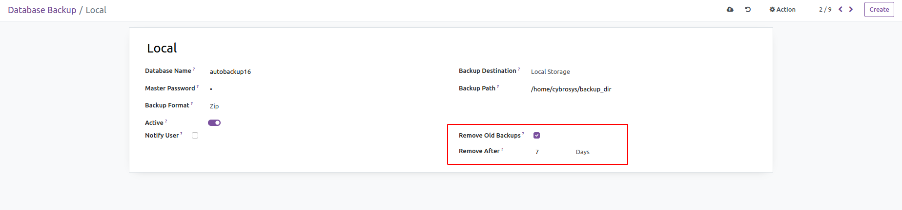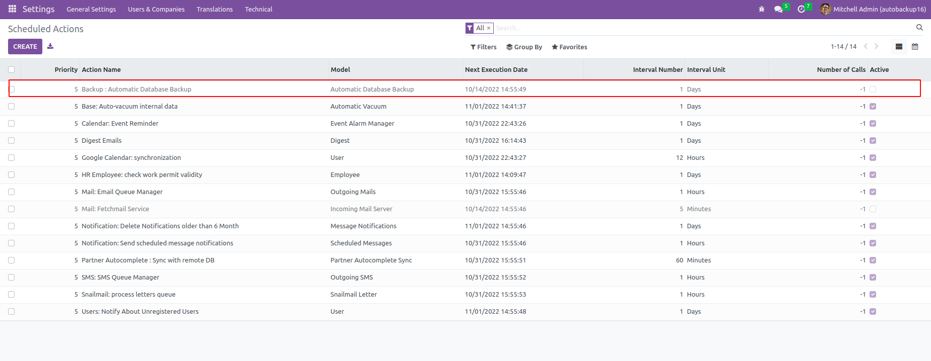Enable the 'Automatic database Backup' scheduled action, and set up the execution interval. Based on the scheduled action setup, backups will be generated on regular intervals.