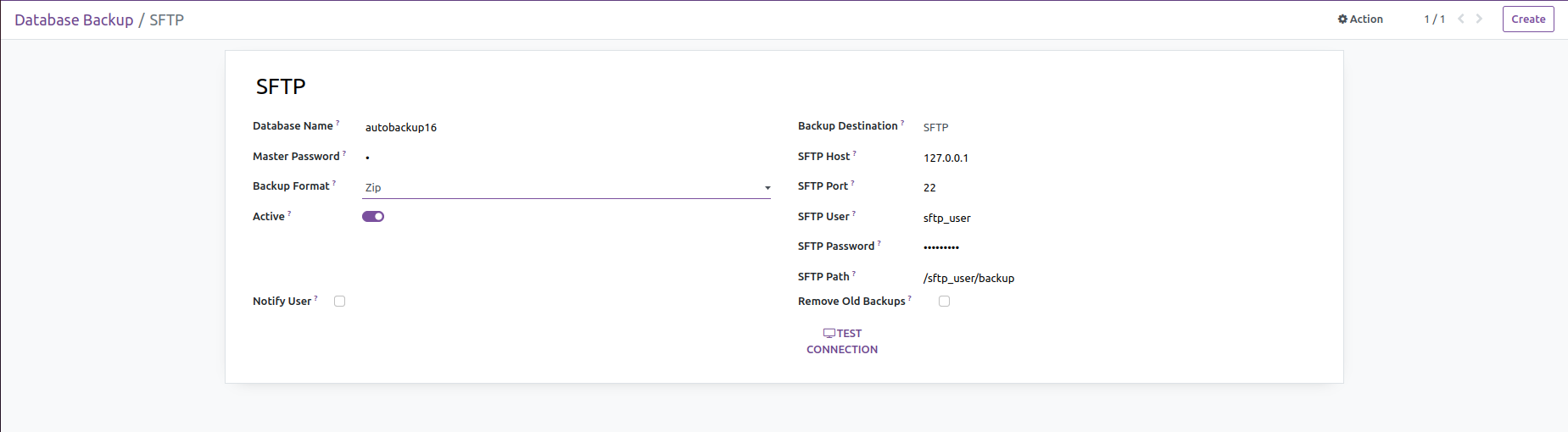 Select backup destination as SFTP, enter credentials. Test connection button to check whether the connection is successful.