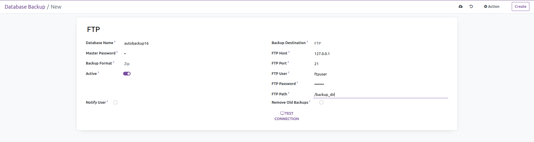 Select backup destination as FTP, enter credentials. Test connection button to check whether the connection is successful.