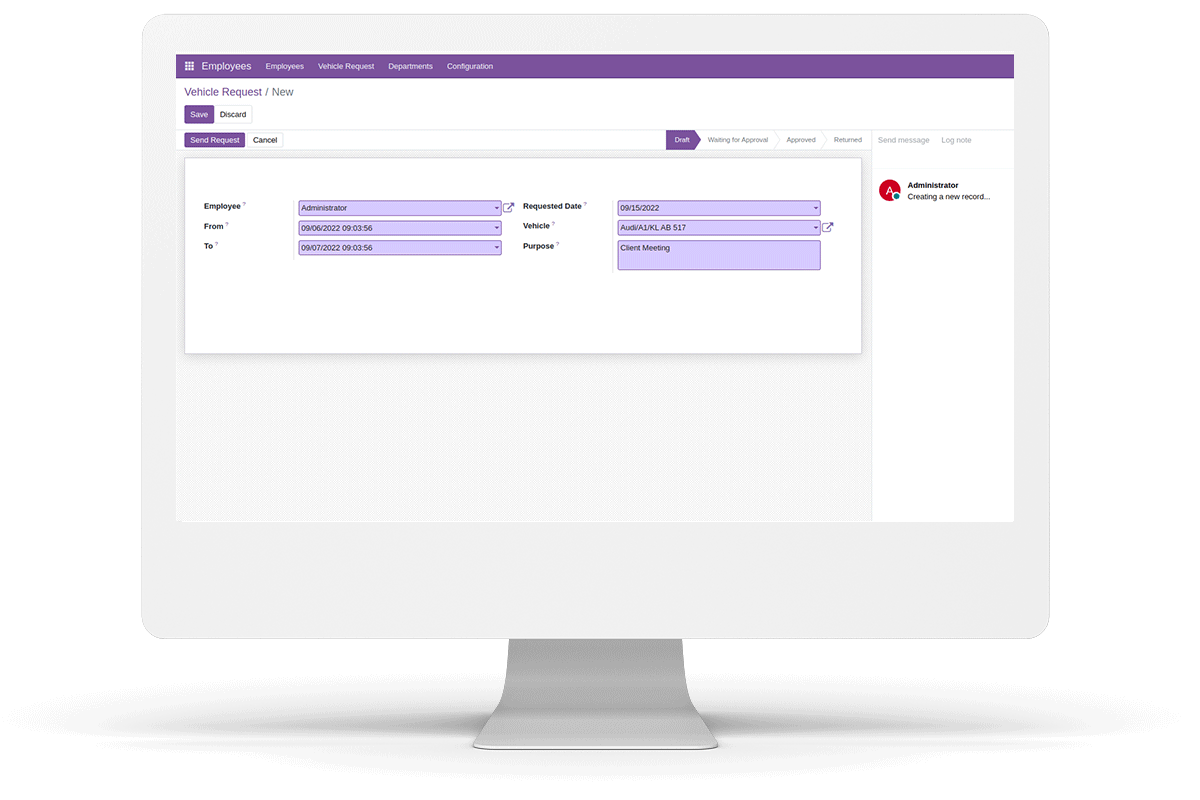 Here any employee can request available vehicle for a time period. He should mention the time period and purpose. Then he can send this request to HR manager. Here the module also checks the availability of vehicle.