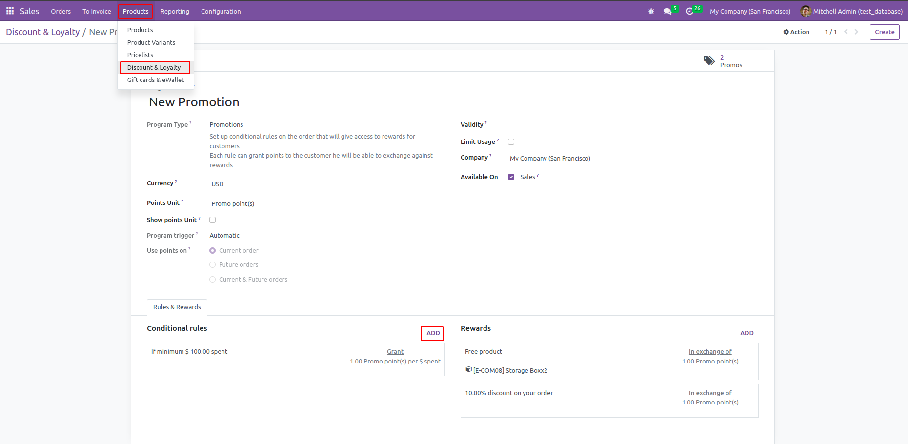 Firstly you should ensure that the debug mode is on. Go to Sale -> Products -> Discount & Loyalty ->Create a new program. After creating the program we can see that a 'Add' button in Rules & Reward section.