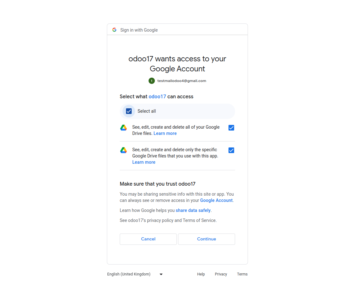 You'll need to create a new Google API project and enabling the Google Drive API, Go to the Google API Console and log into your account. While creating the project, for the Redirect URI restrictions, copy your Odoo database URI followed by /google_drive/authentication. Example: