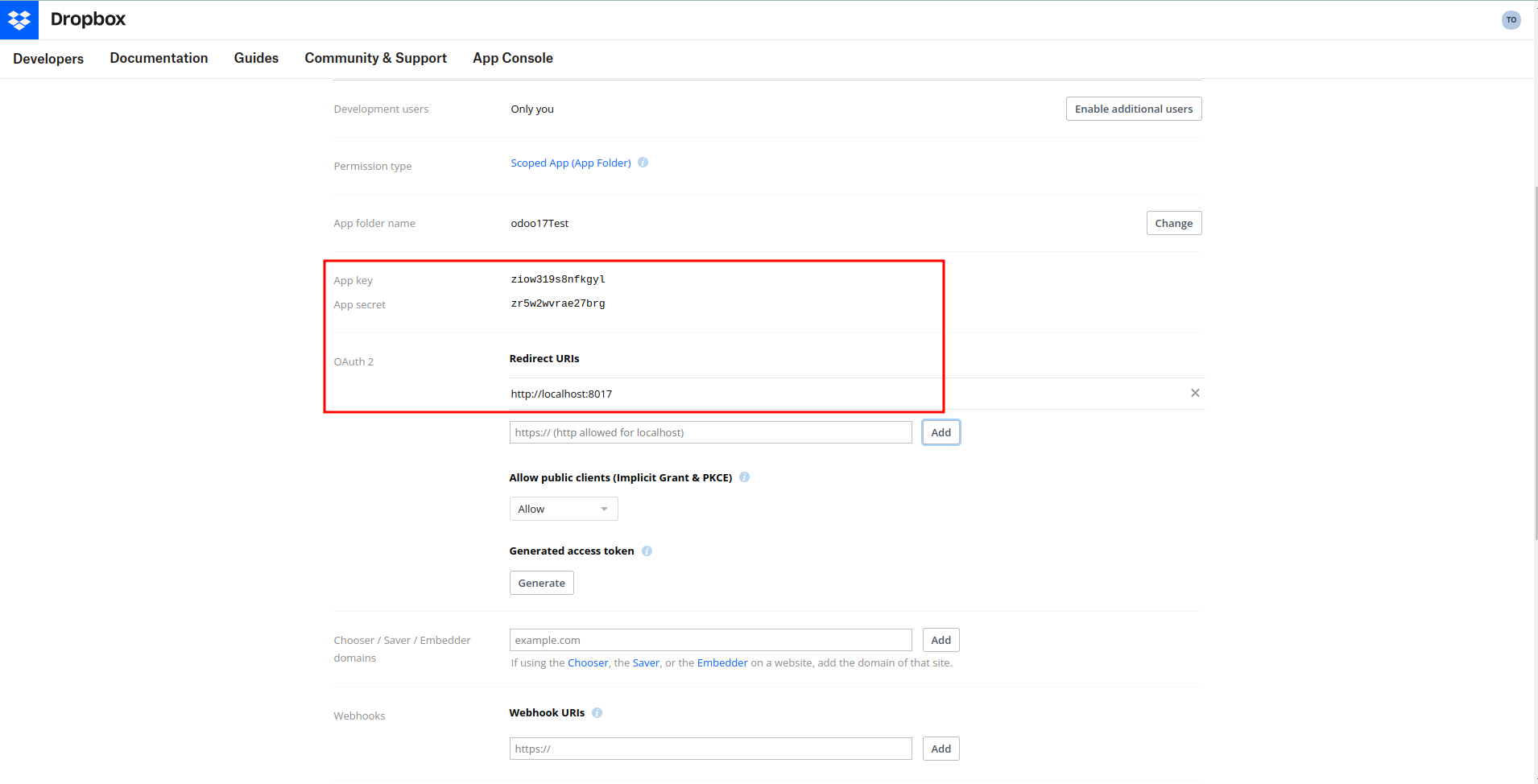 Once you created the App , you can get the App key and App Secret as seen in the screenshot.
