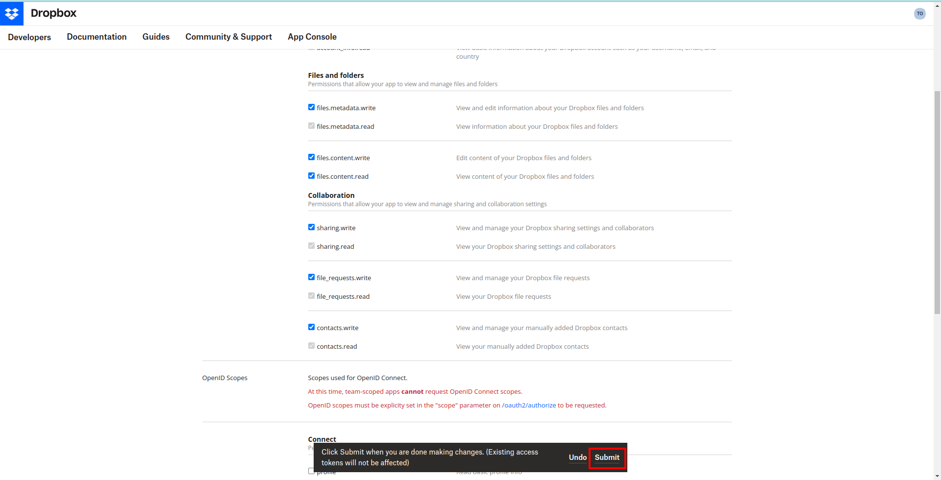 Choose your app's permission (files.content.write and files.content.read permissions required).then click on Submit