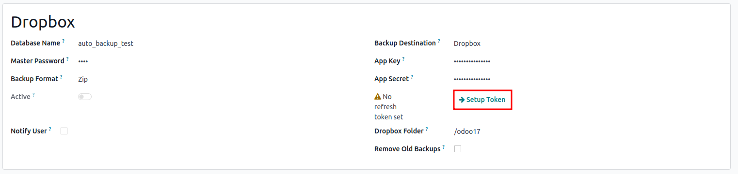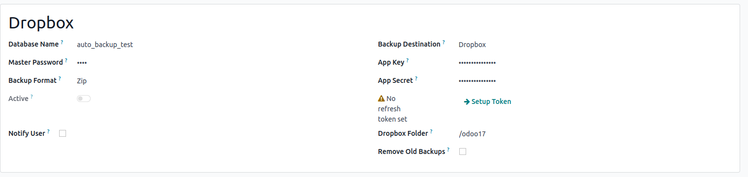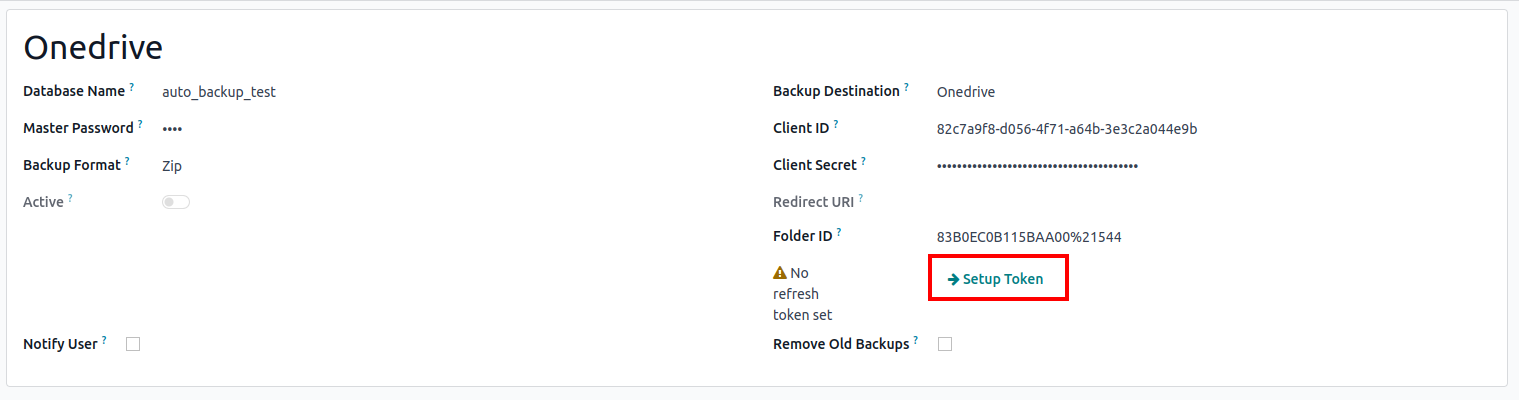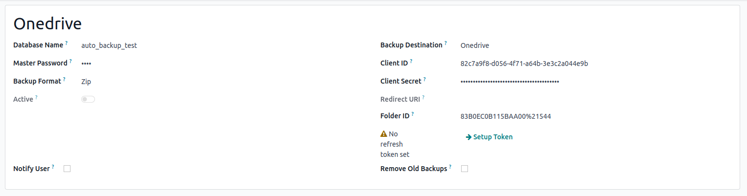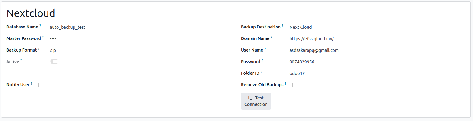 Every day, a Scheduled Action will take place to store a backup on the Nextcloud Server. The backup will be stored as the folder name provided in the Folder ID field in Odoo.