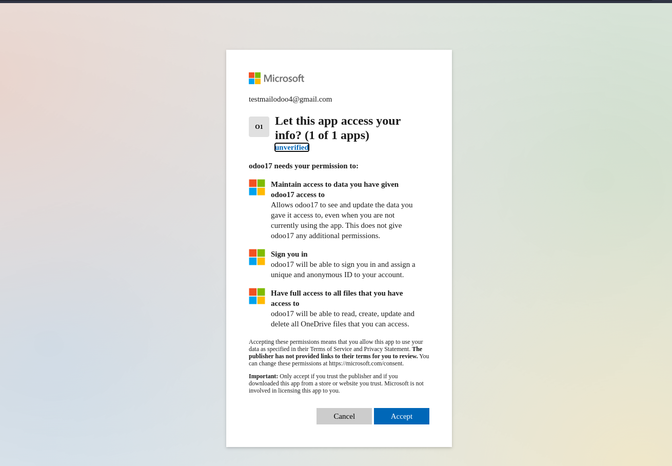 Select Backup Destination as OneDrive. Enter the App key and App secret. you'll need to register a new app in the Microsoft Azure portal. While registering the app for the Redirect URI restrictions, copy your Odoo database URI followed by /onedrive/authentication. Example: