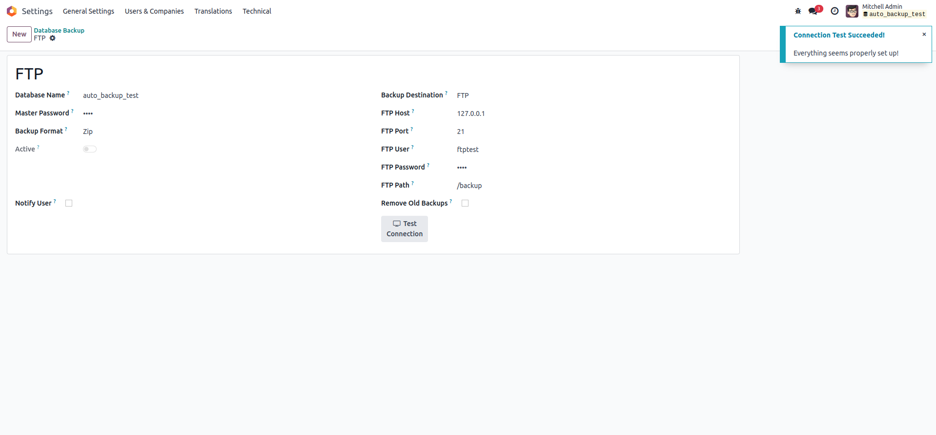 Select Backup Destination as FTP, enter credentials. "TEST CONNECTION" button to check whether the connection is successful.