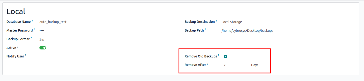 Enable auto remove option, specify number of days to remove backups.
