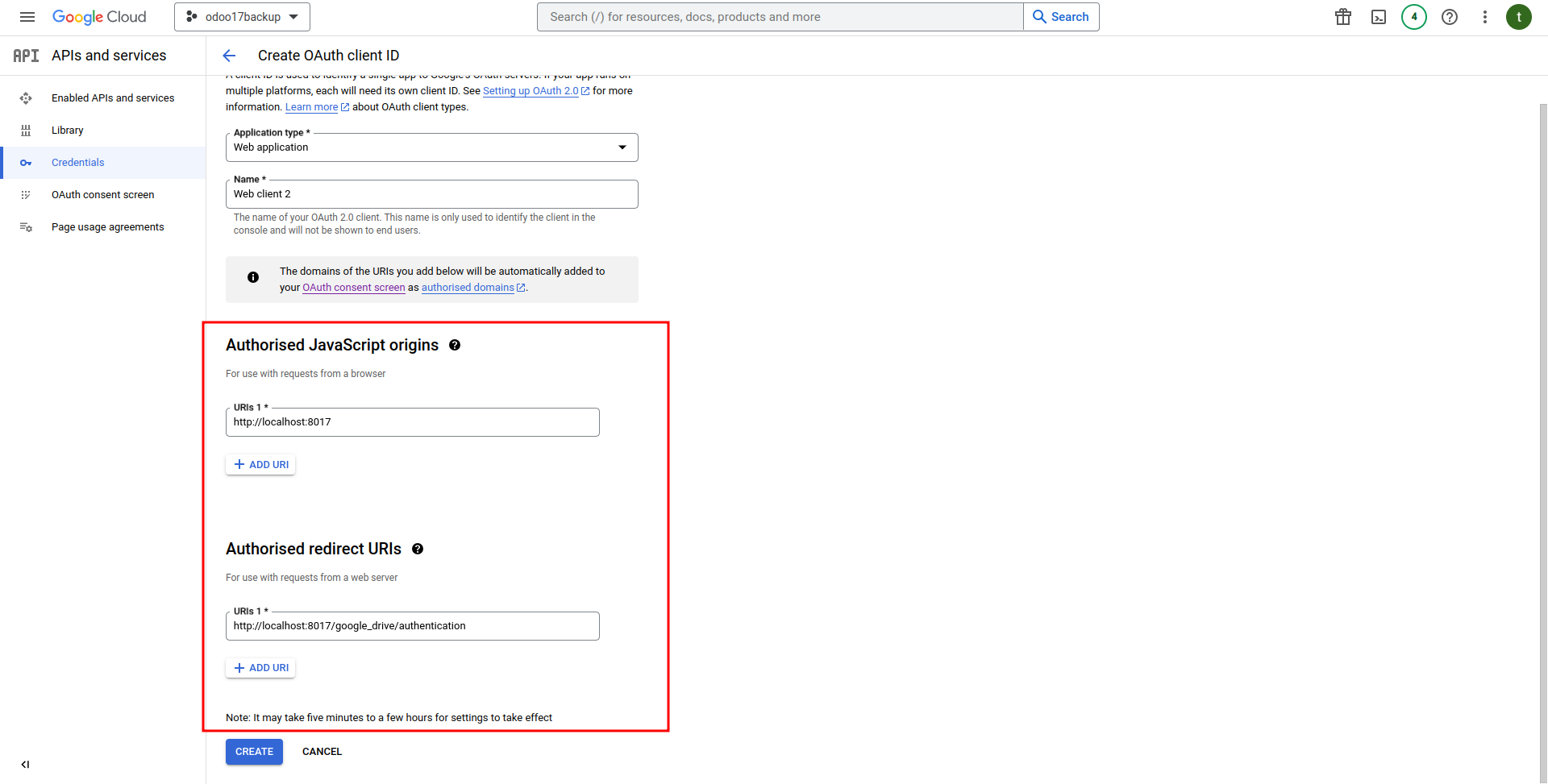 Under the Authorized JavaScript Origins section, click + Add URI and type your company's Odoo URL address. Under the Authorized redirect URIs section, click + Add URI and type your company's Odoo URL address followed by /google_drive/authentication. After all the steps are completed, A Client ID and Client secret will be given, copy the credentials