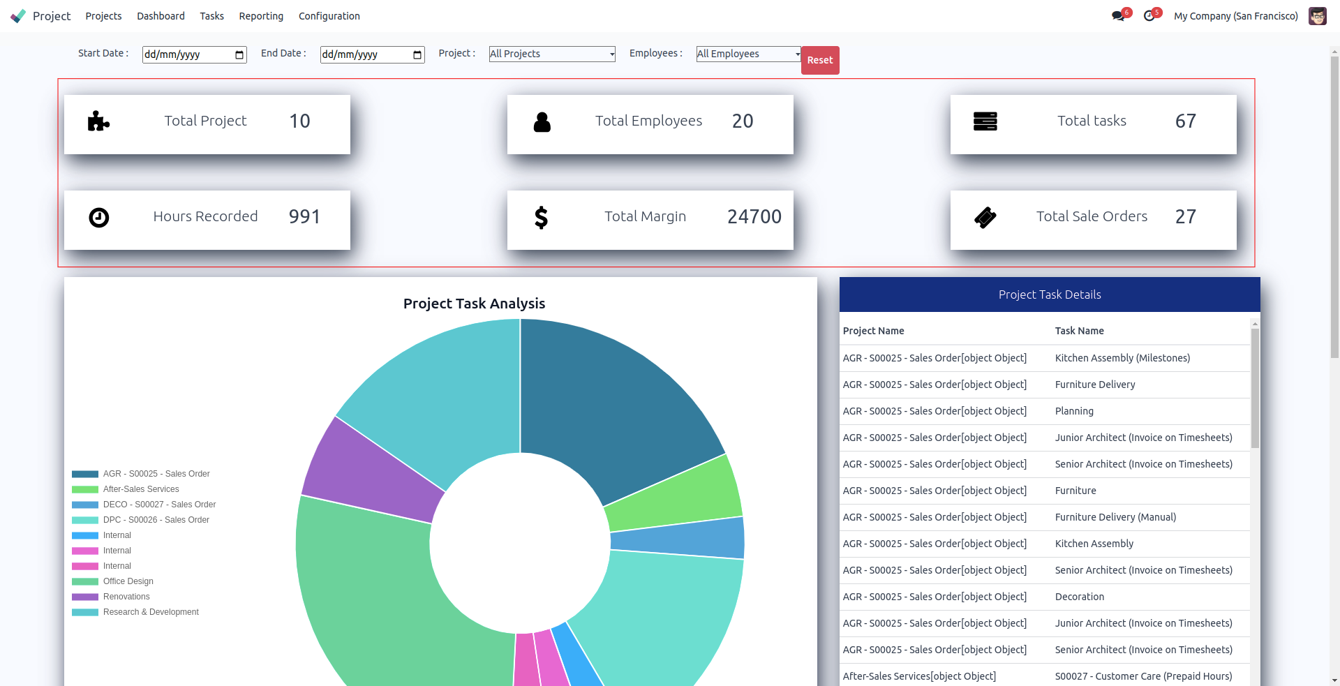 Project Dashboard has different types of Graphs that will give you a complete analyzing of the Project module.