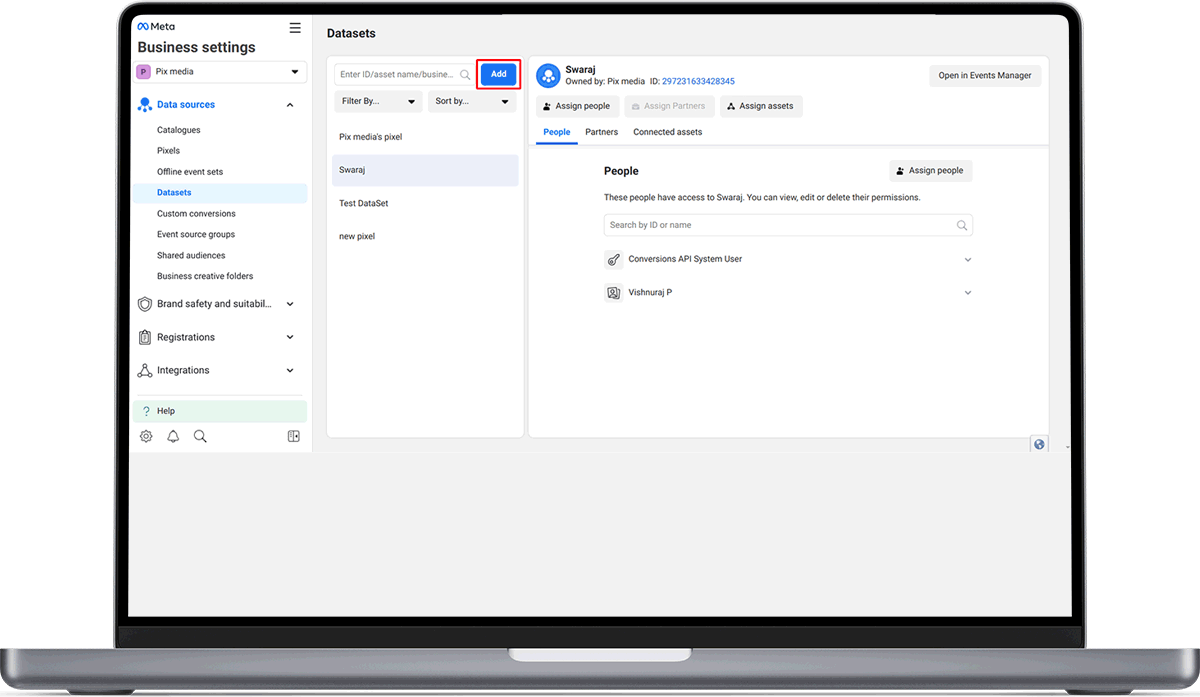 For creating a meta pixel account go to yor meta business account Setting's Data sources -> Datasets -> Add.